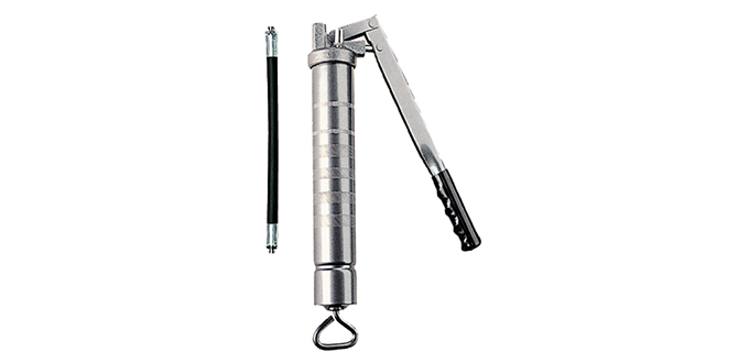 The standard cartridge grease gun with its quick-release key is the indispensable accessory for manual filling operations.